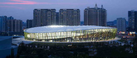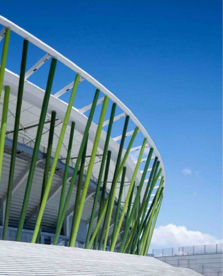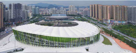 深圳市寶安體育場是2011年大運會足球比賽場,由華南理工大學設(shè)計院和德國GMP公司合作設(shè)計。外圍護結(jié)構(gòu)設(shè)計了像竹竿一樣細密的184根綠色鋼柱,竹林般通透、輕巧;屋頂?shù)陌咨髂そY(jié)構(gòu),似白云飄在竹林上空。上部頂蓋罩棚采用全張拉膜結(jié)構(gòu),讓這座建筑呈現(xiàn)出“舉重若輕”的“素顏”美。