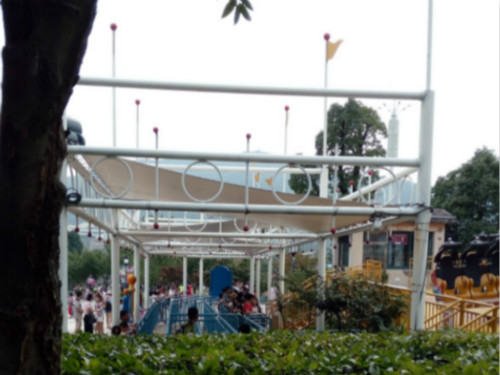 室外游樂設施膜結(jié)構(gòu)遮陽屋頂,設計簡潔不失特色,透光。
