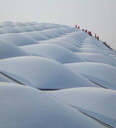 一談到幕墻,大家首先想到的是玻璃,鋁合金,石材等各種硬質材料的建筑幕墻應用形式。而柔性膜結構幕墻的應用依賴于膜結構及膜材的技術創(chuàng)新和發(fā)展,從歷史上來看,材料技術的累積為建筑學帶來越來越多的創(chuàng)意。