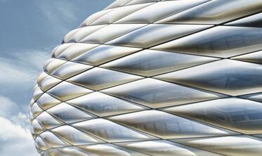 應用于幕墻的膜材有織物膜材和箔片膜材兩大類,前者根據編制不同可分為平織及曲織;根據纖維材質可分為聚酯織物及玻璃織物;根據涂層可分為單邊涂層及雙邊涂層。目前織物涂層膜材是主流材料,包含PVC、PTFE、ETFE膜等。ETFE膜為現(xiàn)代建筑幕墻提供了一個嶄新的材料,經過充氣后這種材料建造的墻體質量輕、韌性好、不易被撕裂、延展性大,此外還具備良好的聲學性能,能有效消除回聲減少噪音。