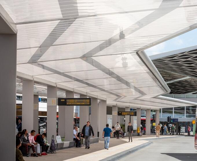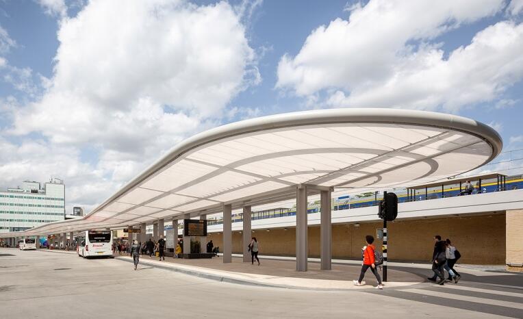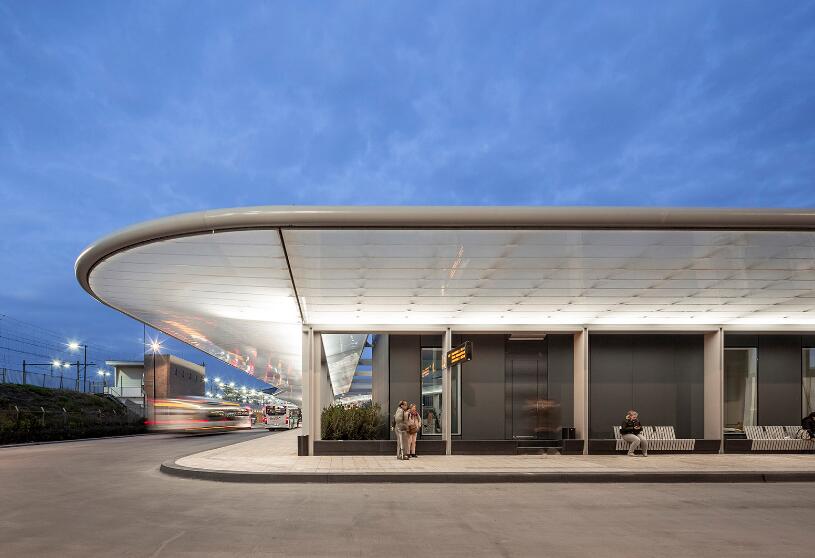 車站由一系列非常薄的柱子組成,頂部是一個簡約的遮陽蓬結(jié)構(gòu),形成了中心開放,長度超過160米的三角形流線。汽車??奎c(diǎn)沿著外側(cè)布置,共有6個上車點(diǎn)1個下車點(diǎn)。遮陽篷結(jié)構(gòu)總體寬度為14到30米,結(jié)構(gòu)功能齊全與城市環(huán)境相協(xié)調(diào),寬闊的遮陽蓬結(jié)構(gòu)完全覆蓋了整個公共汽車站臺和??科嚨囊徊糠郑虼寺每涂梢酝耆谡陉柋苡甑那闆r下上下車。
