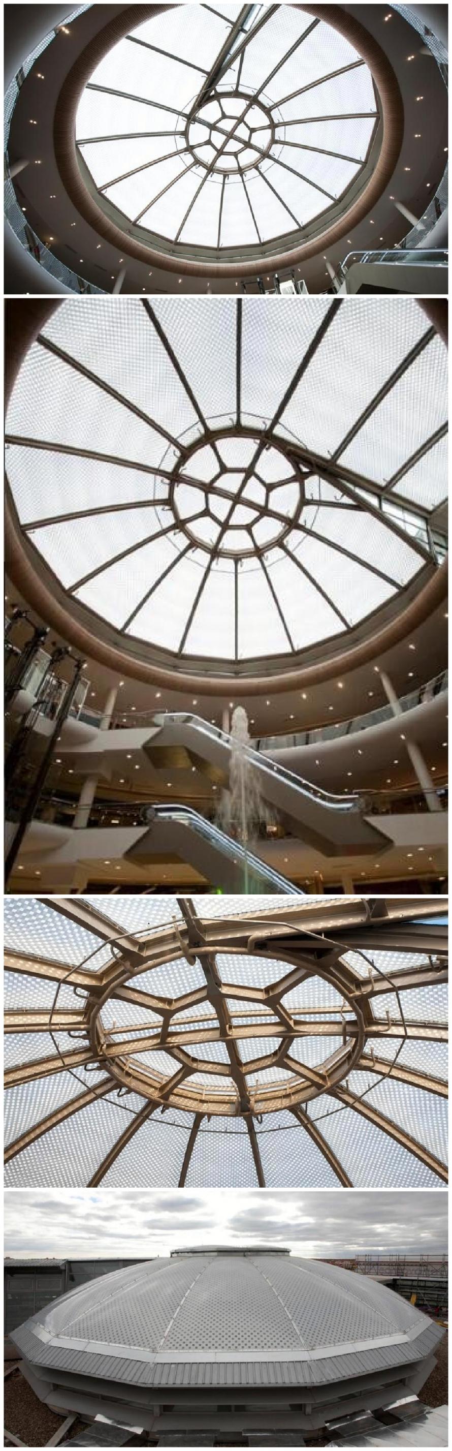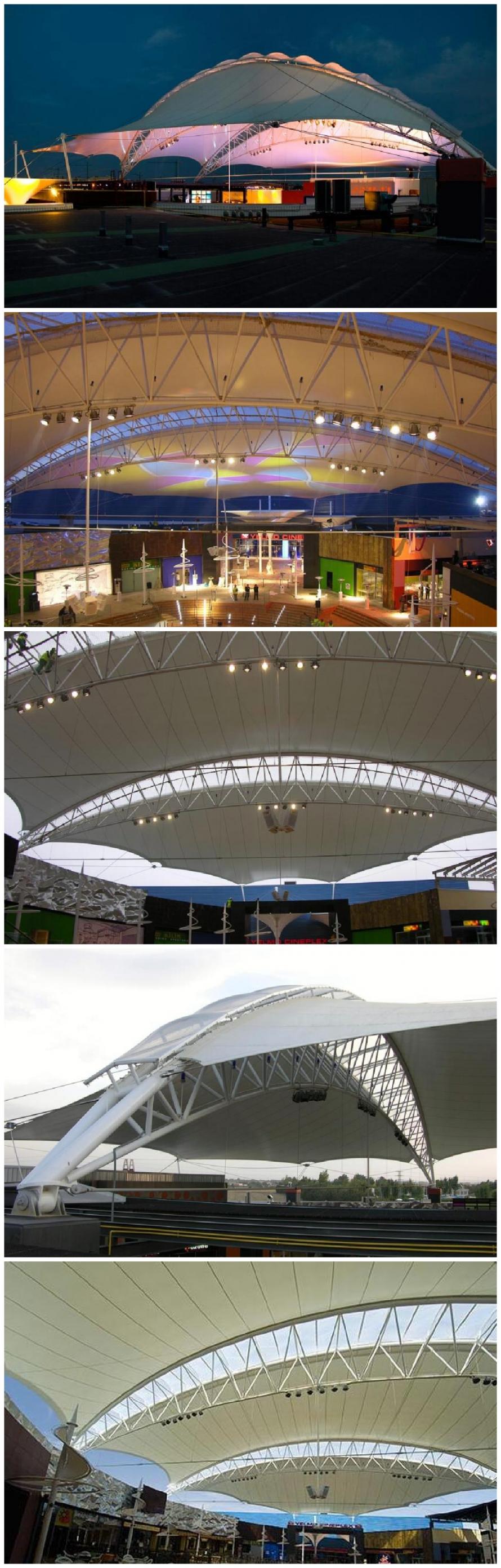 商業(yè)購(gòu)物中心的主要特點(diǎn)是因商業(yè)店鋪的集中而形成了室內(nèi)室外購(gòu)物、休閑、餐飲等功能空間,步行街及中央活動(dòng)區(qū)域是人們行走、休息、交流的開放空間,基于商業(yè)街特色,就決定了所有設(shè)計(jì)的核心就是讓空間更具人性化。屋頂作為建筑附加設(shè)施,不僅要求遮陽避雨的實(shí)用功能,也應(yīng)該是錦上添花的設(shè)施。目前國(guó)內(nèi)外膜結(jié)構(gòu)應(yīng)用于商業(yè)綜合體的工程案例越來越多,膜結(jié)構(gòu)建造的屋頂擁有很多傳統(tǒng)屋頂所不具備的優(yōu)勢(shì)特點(diǎn)。