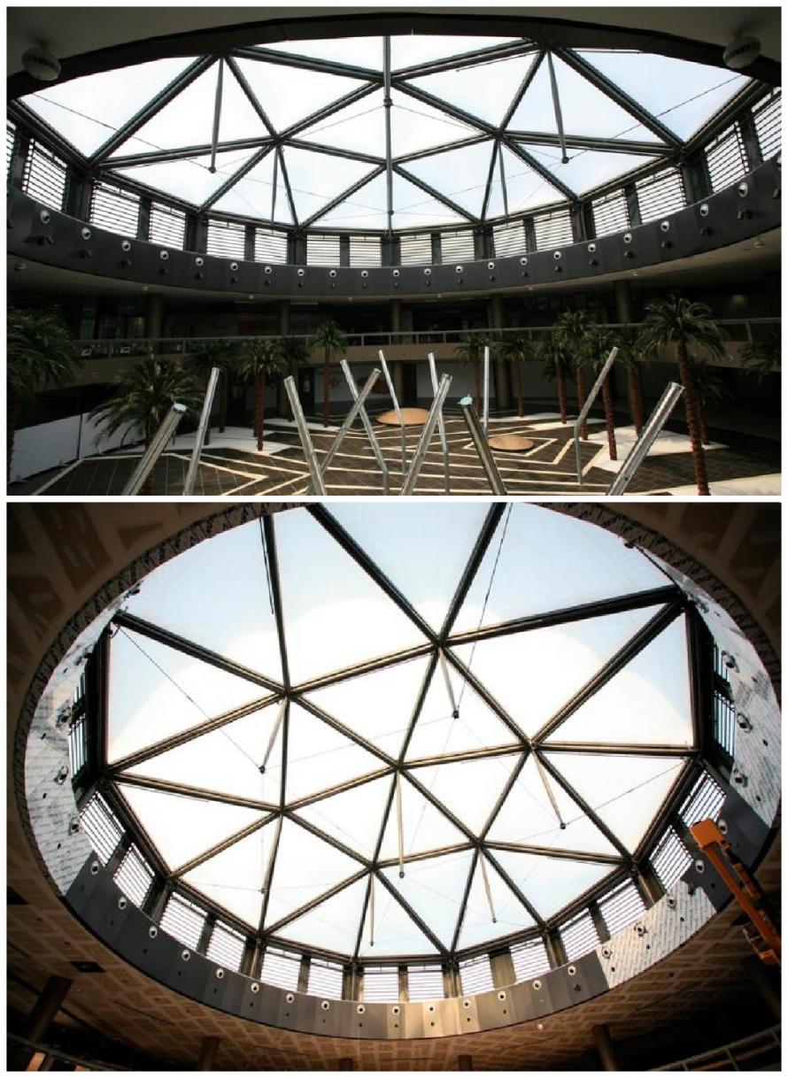 膜結(jié)構(gòu)屋頂材料通常使用PTFE、PVC及ETFE膜材料,其中ETFE膜材因透光度能達(dá)到95%-100%,如玻璃般通透,白天無需額外照明,大大節(jié)約了能耗,故而受到很多建筑師的采用。