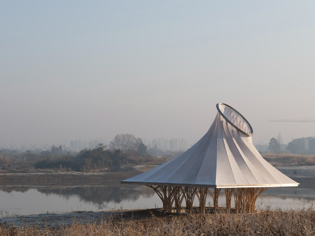 這是一個臨時性的戶外劇場。這種實驗結(jié)構(gòu)旨在將材料的不確定性和不規(guī)則性與精確的幾何形狀相結(jié)合,發(fā)展和重構(gòu)古老材料及新材料的實踐。