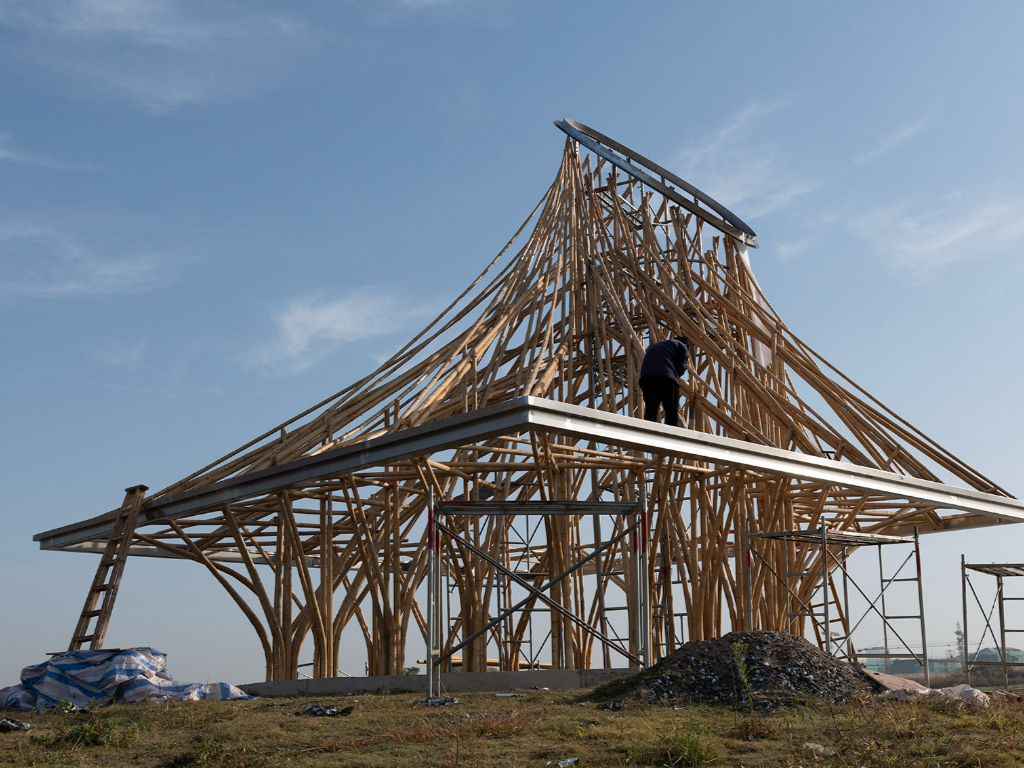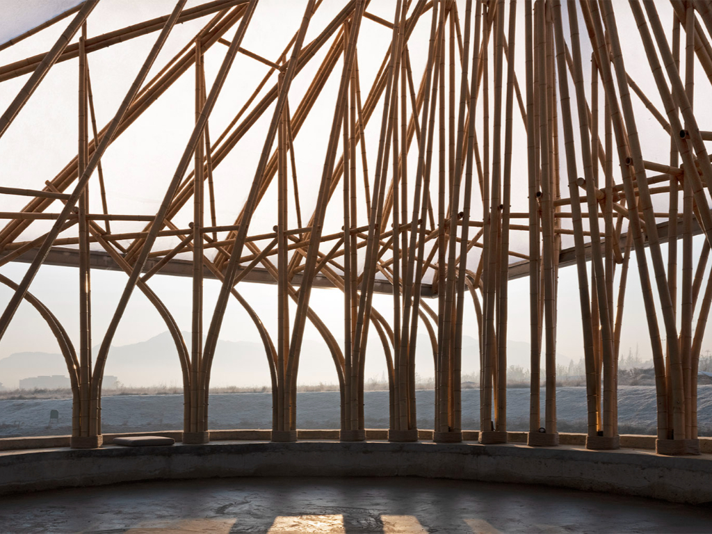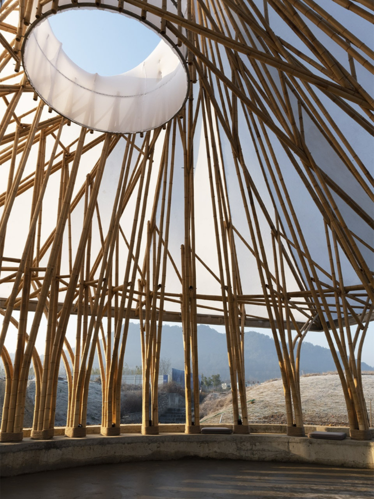 當然,在制作過程中,圓孔處的鋼環(huán),屋檐處的方形鋼架,以及嵌入結(jié)構(gòu)底部混凝土基礎中的板材等一系列不同構(gòu)件都不可忽略。這些構(gòu)件提供了框架與模板,才能完美地連接起每一根竹子。