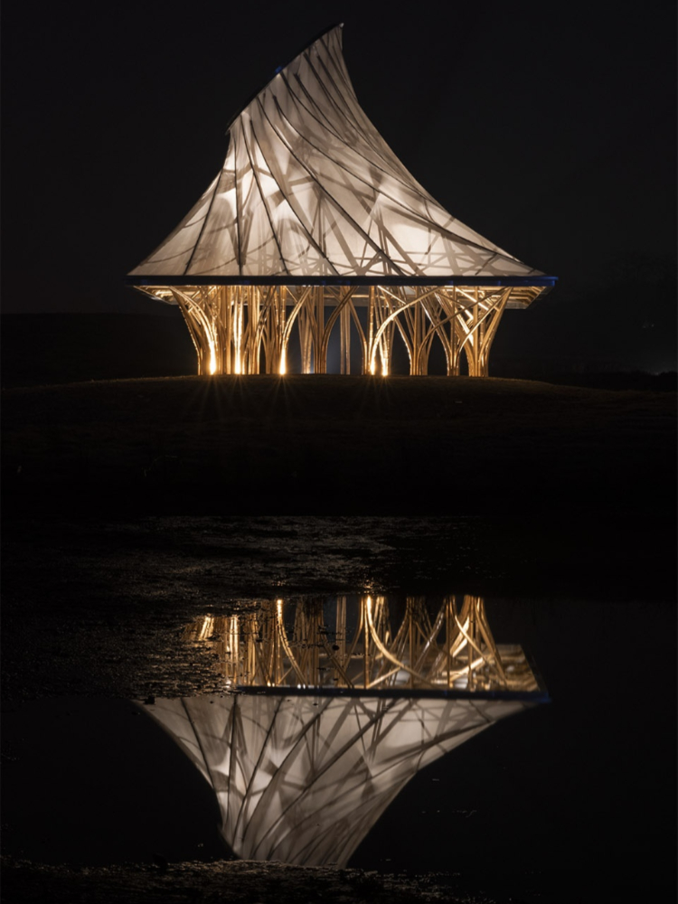 建筑的形式是根據(jù)環(huán)境精心定制的,這個裝置位于一個小島上,四面環(huán)繞著水與群山的景色。劇院下部結(jié)構(gòu)由竹子組成,竹子排列錯落有致,頂部采用白色膜材覆蓋,木結(jié)構(gòu)與膜結(jié)構(gòu)碰撞,提供了一種不同的空間體驗。