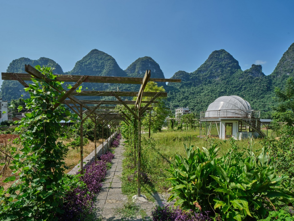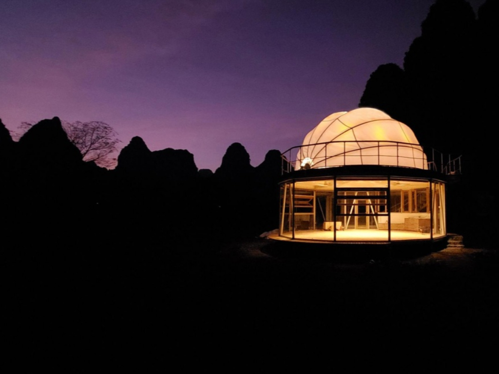 二層的透光膜頂在夜間透出柔和暖光,仿佛在漓江田園間點起一盞球形燈籠,為喀斯特村舍更添一絲奇幻趣味。