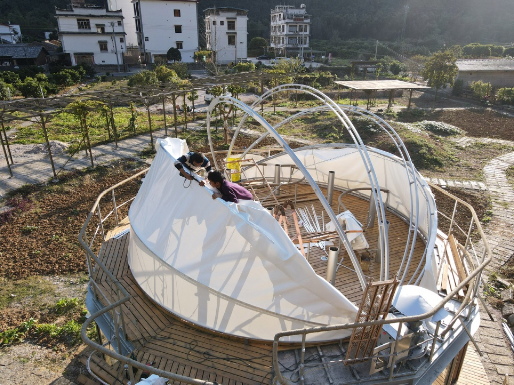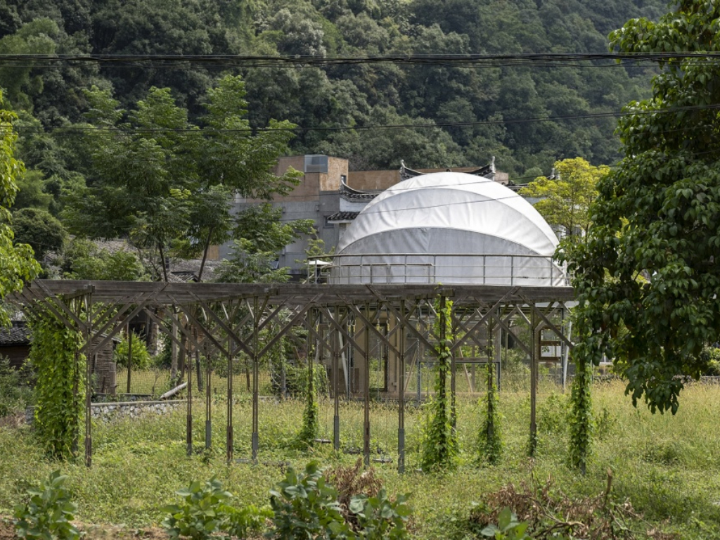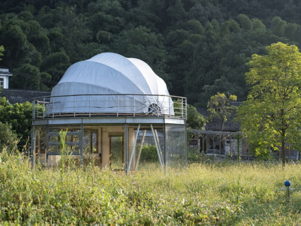 建筑主體分為上下兩個可獨立運作的空間:一層的十二邊形平面為以輕鋼構(gòu)和玻璃圍合成的室內(nèi)服務空間;二層的直徑6.6米半球膜結(jié)構(gòu)則為室外星象觀測平臺提供可開閉式的遮蔽空間。