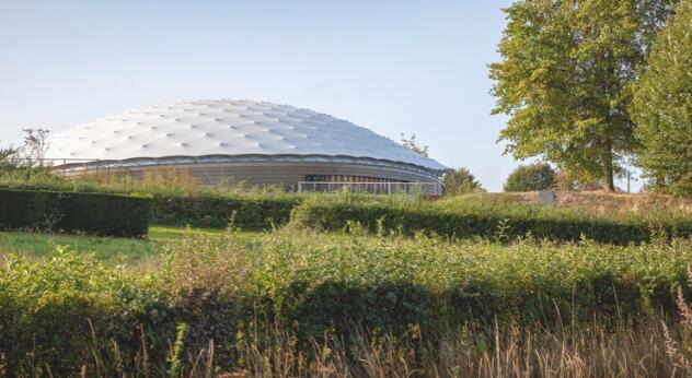 赫魯斯貝克 Shaded Dome 的外形是一個(gè)被拉長的穹頂,由輕型織物構(gòu)成,隱喻在市場花園行動(dòng)中布滿天空的降落傘。建筑坐落在一個(gè)平坦的山頂上,略微向山谷傾斜,同時(shí)在該方向上削減體量,形成醒目的入口空間。辦公室和倉庫位于地下,上部空間留給餐廳,在這里可以遠(yuǎn)眺山谷——當(dāng)年盟軍各師就是從這里開始向德國進(jìn)發(fā)。