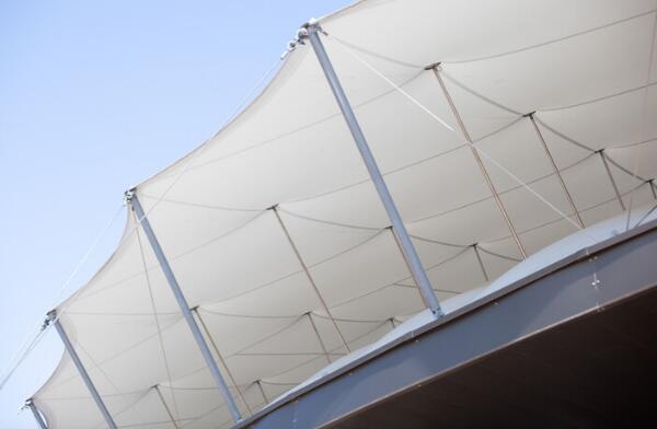 Shaded Dome被安裝在一個(gè)混凝土的基座上,內(nèi)部開有門窗洞口,它包括一個(gè)由氣壓支撐的穹頂,一個(gè)鋼索網(wǎng),以及一個(gè)大跨度的高科技織物屋頂。穹頂內(nèi)外的織物被分隔構(gòu)件隔開,相互絕緣。