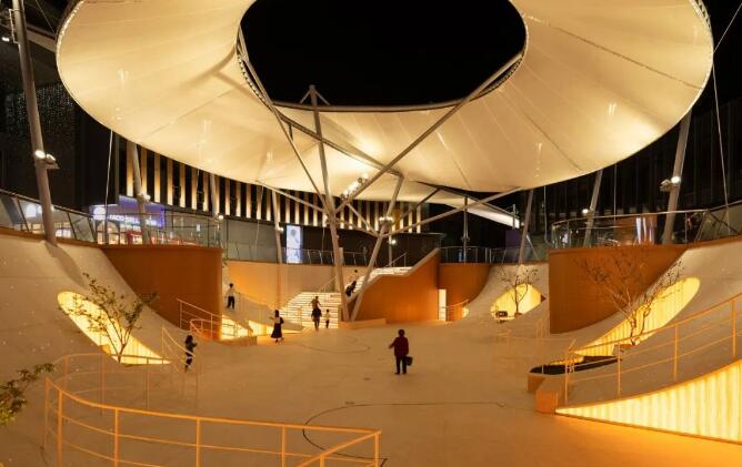 輕盈的木紋透光玻璃表達(dá)的立面與面層邊緣,使得整個(gè)水洗石面層在夜晚如同從地面掀起的薄殼。配合種植池中設(shè)置的投影與柱體上的燈光,膜結(jié)構(gòu)的表面成為了光影的接受器,場地中光的元素相互配合,消減了原有的物質(zhì)材料性,營造出沉浸式的互動(dòng)光影藝術(shù)情境,令這一地下入口廣場空間成為日落之后的重點(diǎn)氛圍舞臺。