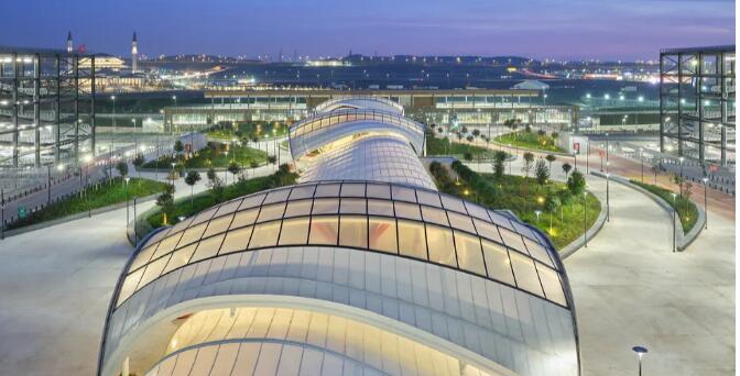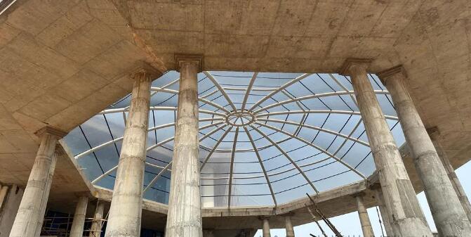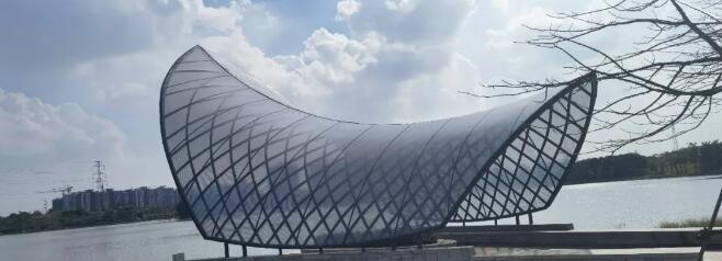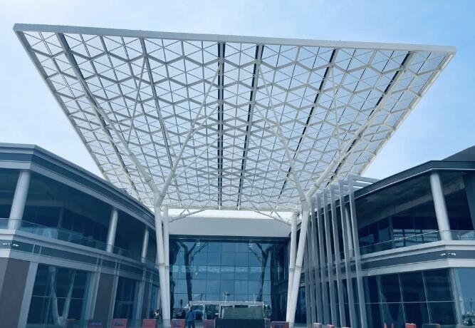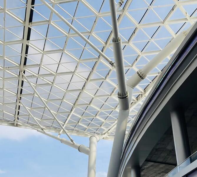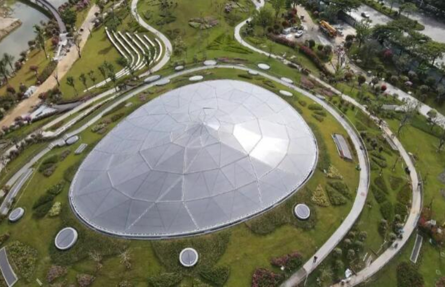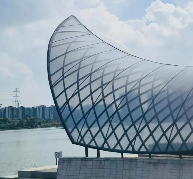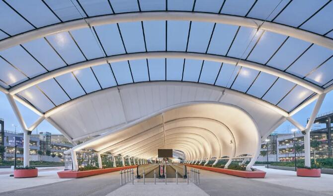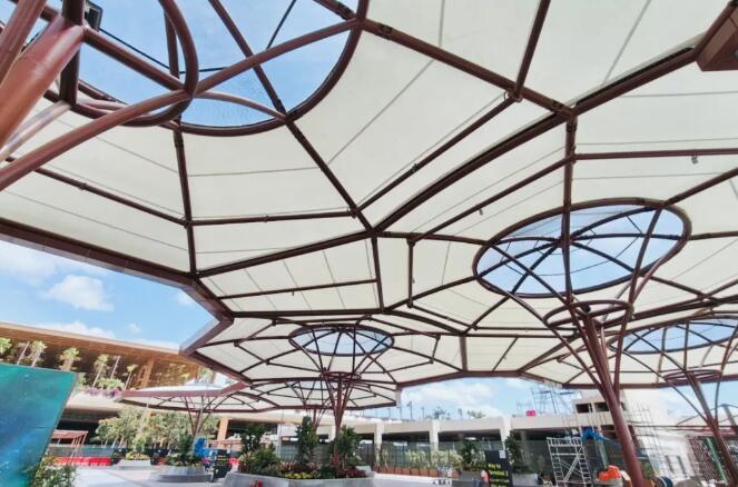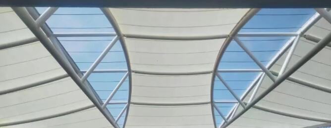 STFE膜是在高韌度聚芳酯纖維網(wǎng)格上進行特種含氟聚合物透明膜覆膜而成的新型高透光膜材,是一款真材實料的“軟玻璃”;STFE膜材單方重量為900g,不到1kg/m2(一般中空lowE玻璃重量為30kg/m2左右),可大面積張拉,結構輕盈又百分百防水。與此同時STFE膜又具有高透光且高透景的特點,適用于需要自然采光和合適紫外線照射的動植物園,陽光房,體育場,以及需要透光且透明的公共建筑(如交通通道,購物中心,天幕,中庭等),是應用越來越多的新型膜結構材料。