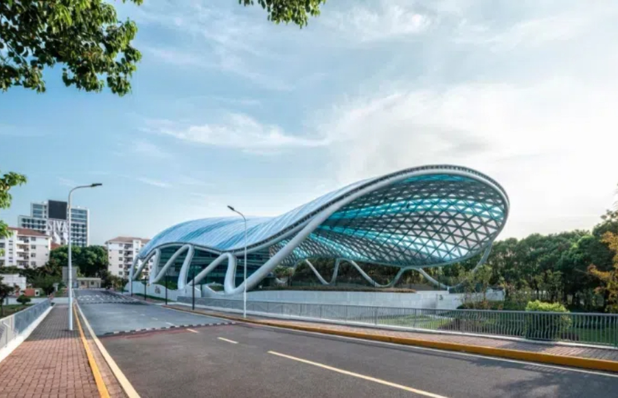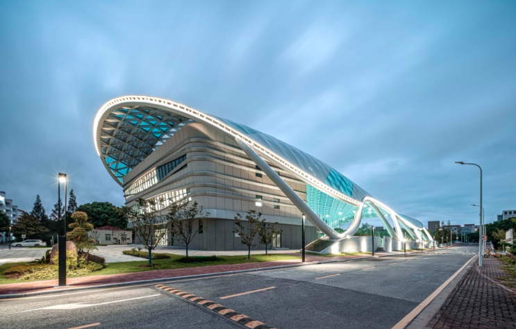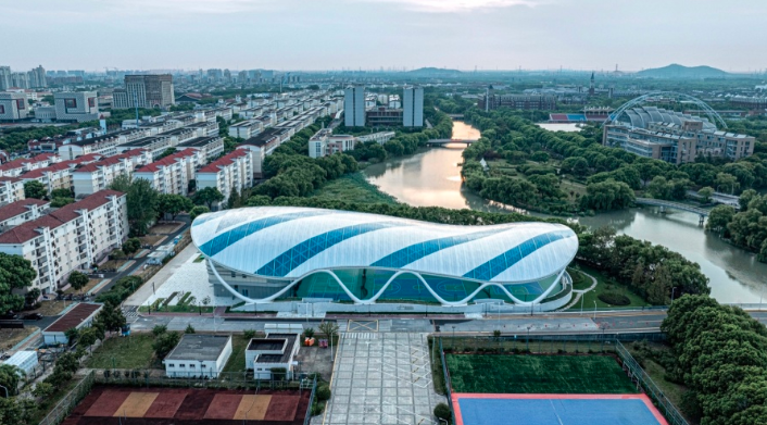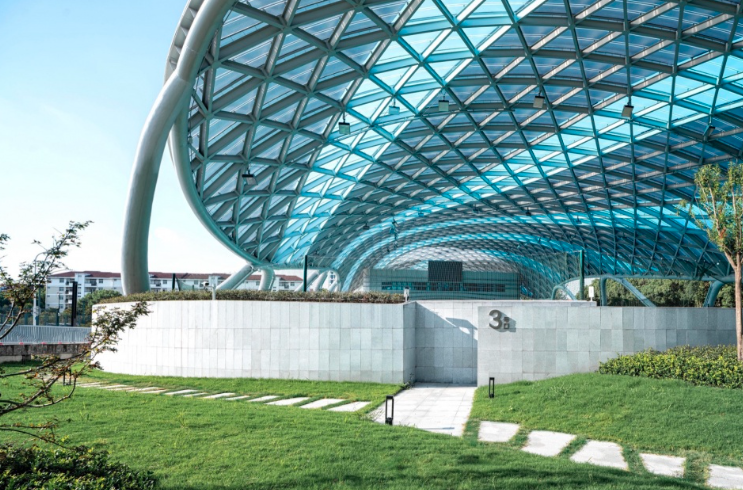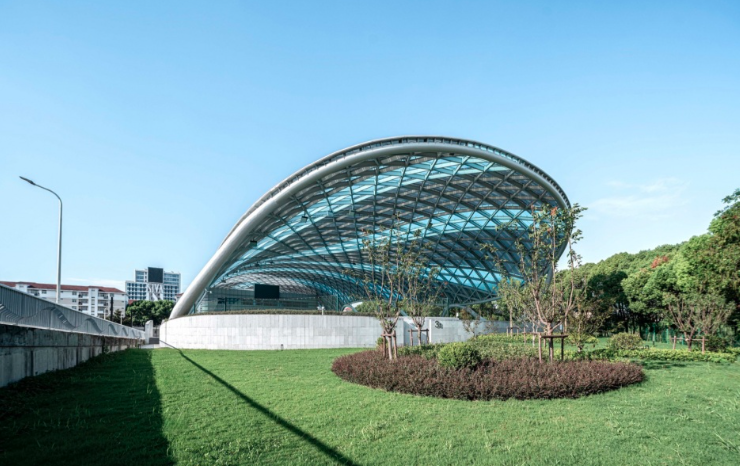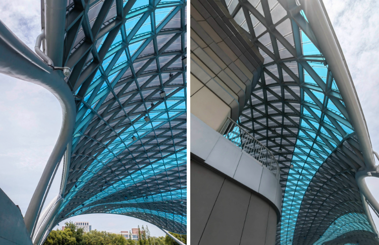 弧形屋面由單層 ETFE張拉膜包裹金屬骨架形成,骨架由簡(jiǎn)潔的三角元素拼合而成。從內(nèi)部看,富有節(jié)奏和律動(dòng)的變化,產(chǎn)生了韻律之美。在膜材的選擇過程中,特意選取藍(lán)、白兩種顏色以及不同透明度的膜材,按照金屬鋼骨架的結(jié)構(gòu)走向進(jìn)行間隔搭配布置,呈現(xiàn)出跳躍般的變化?;⌒蔚谋砻娣瓷涑鲋車h(huán)境,模糊了屋頂與天空的界線。建筑兩個(gè)長(zhǎng)邊采用了波浪狀的飄帶鋼柱展現(xiàn)出柔中有剛的力量感,實(shí)現(xiàn)了結(jié)構(gòu)成就建筑之美的理念。