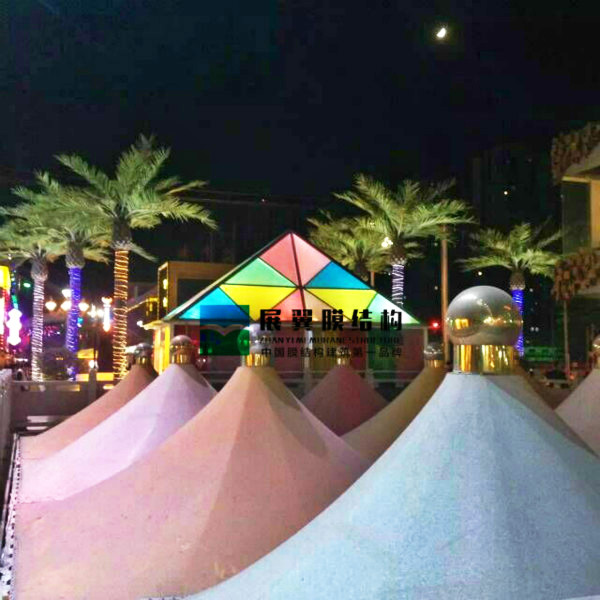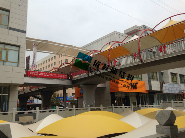 蘭州金牛街膜結構工程全系列包括膜結構天井、膜結構屋頂遮陽棚、膜結構天橋通道遮陽棚、啤酒屋膜結構屋頂、特殊膜材玻璃房等等、工程全部采用彩色膜材搭配建造,造型設計別出心裁。這些張拉膜建筑不但具備強大的實用功能,同時也成為了商業(yè)街一大觀賞亮點。