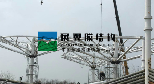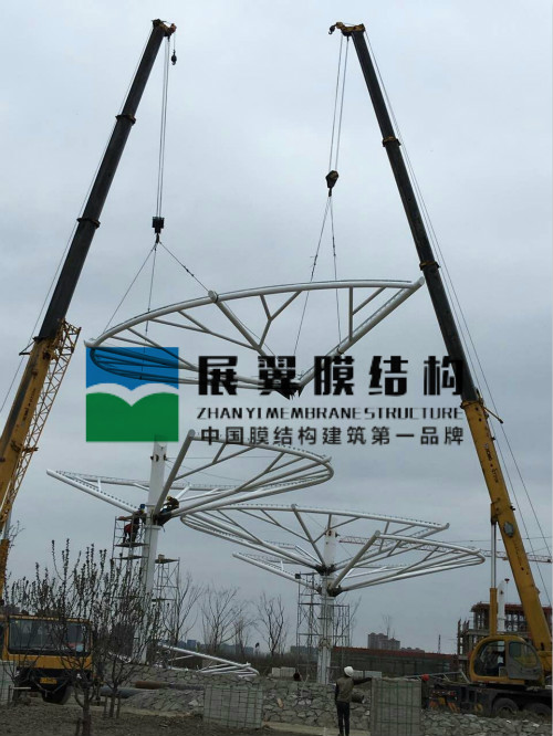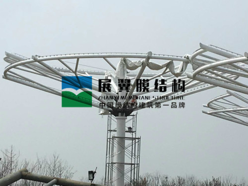 鹽城城南新區(qū)農業(yè)示范園景觀膜結構工程處于緊張的施工階段,工人們全力以赴已完成“七朵花”的花盤鋼構吊裝工作,七個大花盤直徑分別是18米,16米,12米,鋼構完成后將進行張拉膜覆蓋安裝工作。