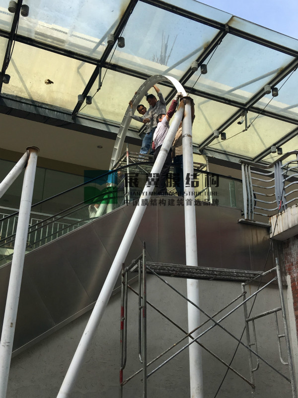 江西贛州萬盛廣場電梯膜結構雨棚工程近日正在施工,鋼結構加工完畢后進入安裝工序,之后將是膜材的覆蓋工作,下面是現(xiàn)場施工圖: