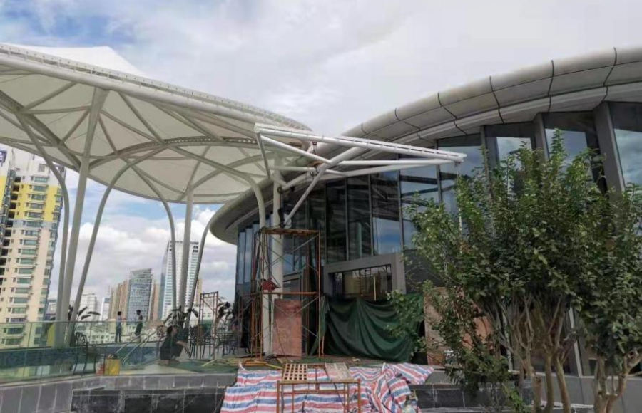 佛山雄盛王府屋頂泳池膜結(jié)構(gòu)頂棚工程近日基本完工,工程采用PTFE膜材,目前工人正進行最后完善工作。