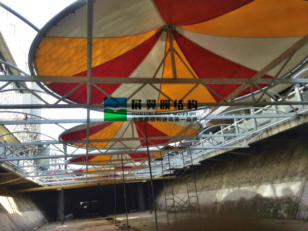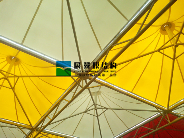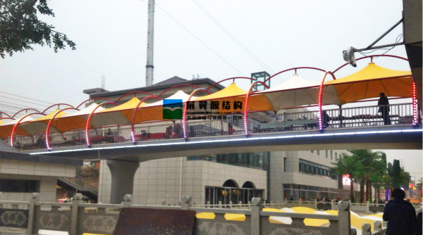 蘭州金牛街膜結構工程全系列包括膜結構天井、膜結構屋頂遮陽棚、膜結構天橋通道遮陽棚、啤酒屋膜結構屋頂、特殊膜材玻璃房等等、工程全部采用彩色膜材搭配建造,造型設計別出心裁。這些張拉膜建筑不但具備強大的實用功能,同時也成為了商業(yè)街一大觀賞亮點。