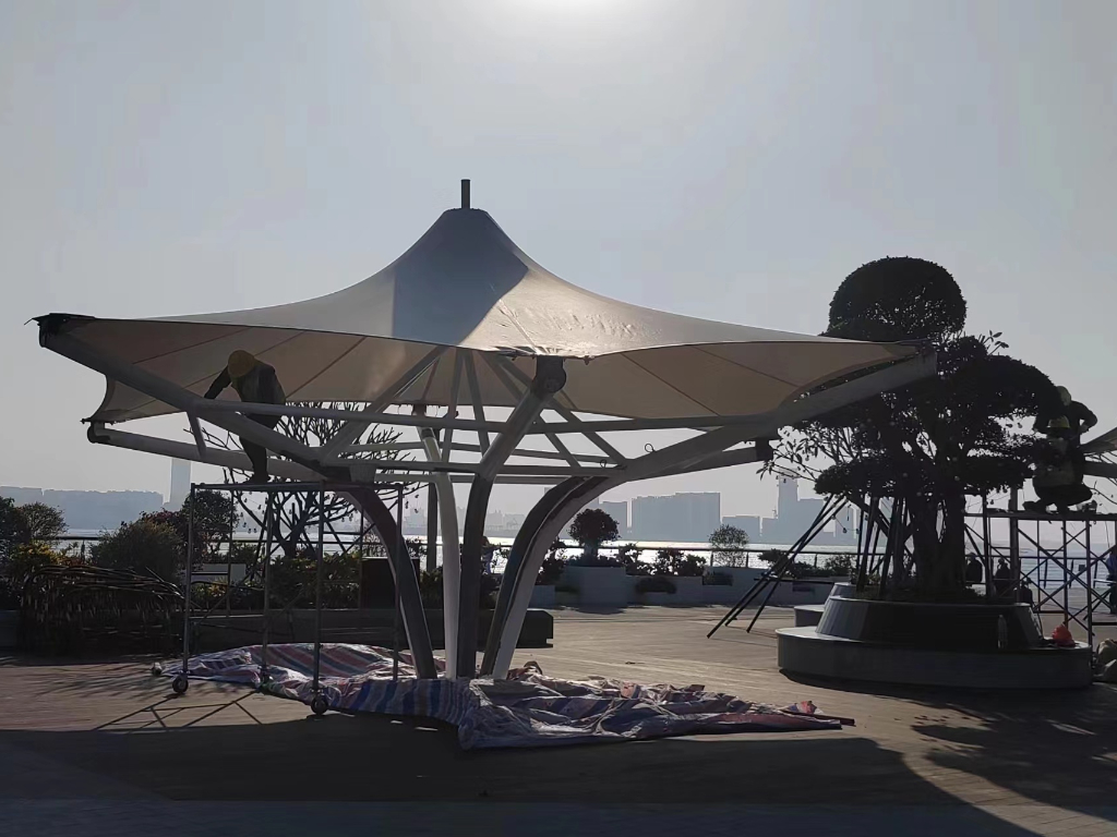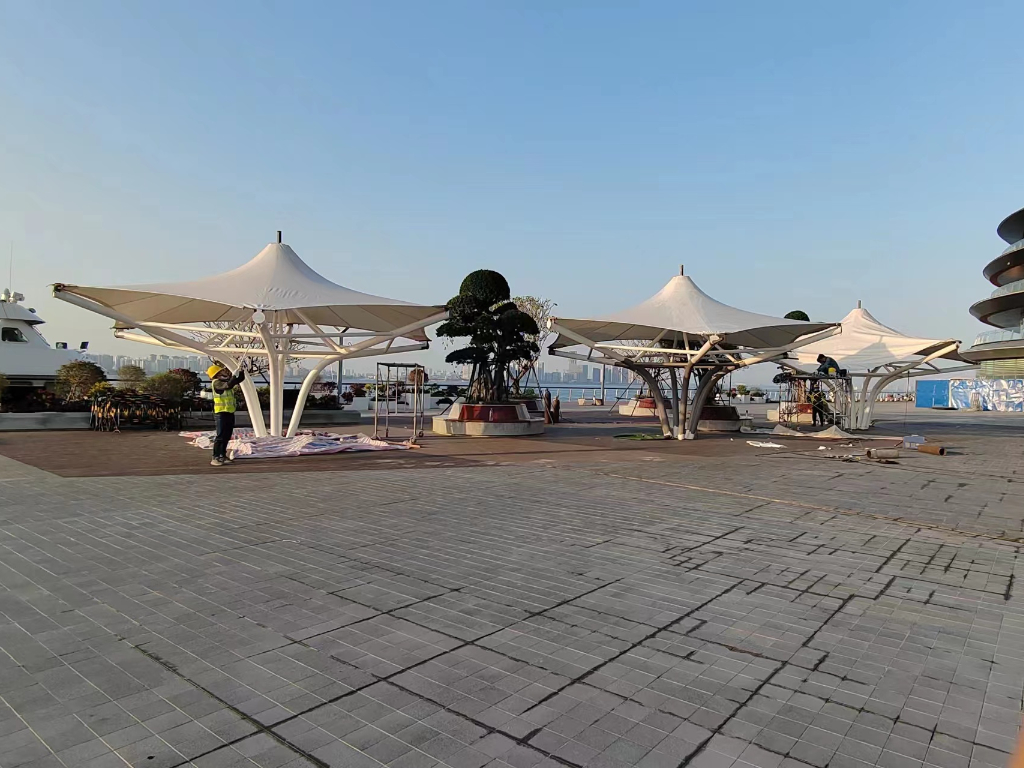 ??跒硰V場(chǎng)景觀張拉膜結(jié)構(gòu)工程近日基本完工,膜材已覆蓋完畢,三組體量的涼亭立于海邊廣場(chǎng),既是遮陽(yáng)避雨設(shè)施,又是與環(huán)境契合完美的景觀裝置。