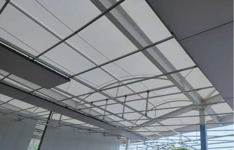 成都市雙流區(qū)二手車市場(chǎng)張拉膜結(jié)構(gòu)大棚工程正在施工,現(xiàn)場(chǎng)看到錯(cuò)落有致的鋼構(gòu)上方膜材已覆蓋張拉成形,高低起伏的拱形屋頂顯得美觀又時(shí)尚,底下空間敞亮,整個(gè)結(jié)構(gòu)穩(wěn)固而結(jié)實(shí)。