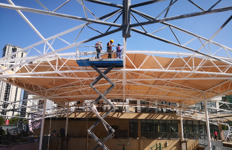 四川德陽青衣江路學(xué)校風(fēng)雨操場膜結(jié)構(gòu)項目已完成鋼結(jié)構(gòu)安裝,目前正進(jìn)行膜材覆蓋工作。