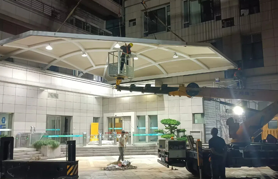 杭州電信大廈張拉膜結(jié)構(gòu)頂棚工程正在進行施工,目前已完成頂棚的吊裝工作。