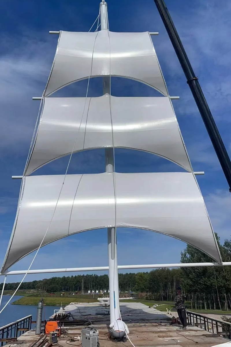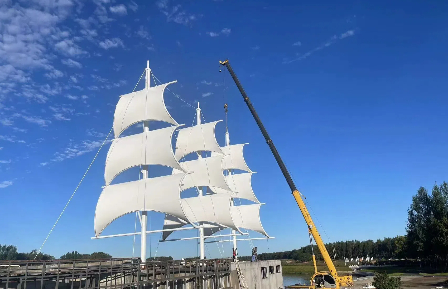 黑龍江省鐵力市景觀膜結(jié)構(gòu)工程“風(fēng)帆”已接近完工,工程以“風(fēng)帆”為靈感設(shè)計了一組景觀裝置,豎起的鋼管桅桿,膜材張拉出風(fēng)帆形狀,似一艘巨輪揚帆啟航。
