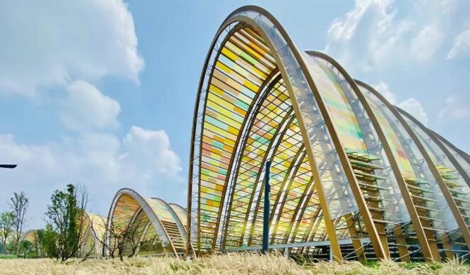 ETFE 膜材的優(yōu)點:透光率高(透明膜材可達(dá)90%)、透光透景,色彩豐富(可以各種顏色,而且通過鍍點可以控制透光率和遮陽系數(shù)),柔韌性好,非常適合應(yīng)用于(氣枕式)充氣膜結(jié)構(gòu)形式,以及膜單元板塊面積較小的單層張拉膜。