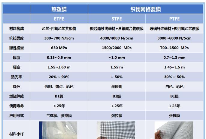 在建筑和結(jié)構(gòu)的方案設(shè)計階段,選擇高透光率的膜材時,常常會對不同種類膜材的特點把握不準(zhǔn)。本文針對這個問題,將ETFE、STFE、PTFE高透膜的各自特點,進(jìn)行詳細(xì)的梳理,以期為高透膜的選擇提供有理有據(jù)的技術(shù)支撐。