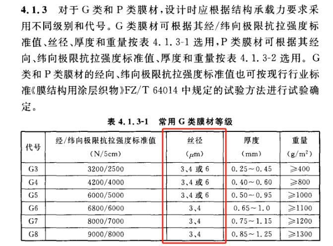 《膜結(jié)構(gòu)技術(shù)規(guī)程》CECS 158 里對G類膜材(也就是在玻璃纖維基材上涂覆PTFE的一大類膜材)的強(qiáng)度等級進(jìn)行了劃分,分為G3~G8六個(gè)等級。