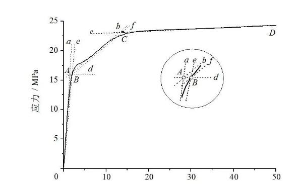 ETFE膜材在應(yīng)力不超過第一轉(zhuǎn)折點(diǎn)時(shí)可以認(rèn)為是線彈性材料,第一轉(zhuǎn)折點(diǎn)和第二轉(zhuǎn)折點(diǎn)之間材料發(fā)生了屈服,兩個(gè)轉(zhuǎn)折點(diǎn)分別定義為ETFE膜材的第一屈服點(diǎn)和第二屈服點(diǎn)。圖中,B點(diǎn)即為第一轉(zhuǎn)折點(diǎn),對(duì)應(yīng)的應(yīng)力為第一屈服強(qiáng)度;C點(diǎn)即為第二轉(zhuǎn)折點(diǎn),對(duì)應(yīng)的應(yīng)力為第二屈服強(qiáng)度。
