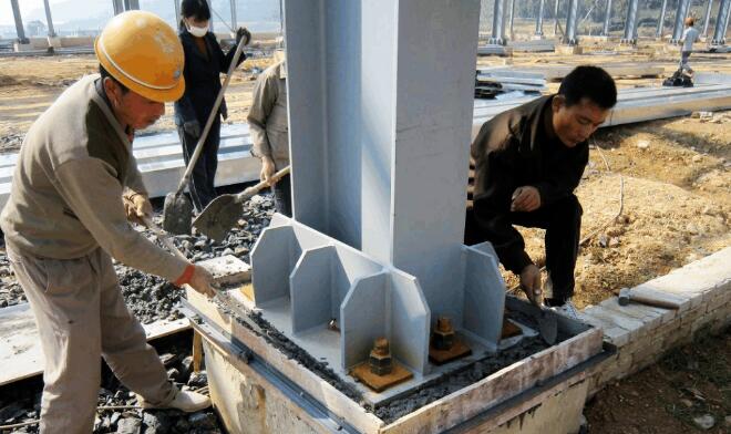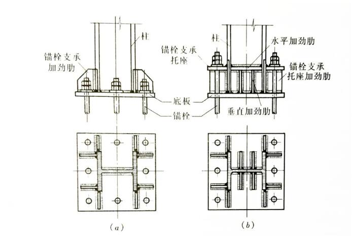 錨栓不宜用以承受柱底水平反力。此水平反力首先通過柱腳底板與混凝土面之間的摩擦力傳遞給混凝土基礎(chǔ);當(dāng)柱底水平力大于摩擦力時(shí),需要設(shè)置抗剪鍵來抗剪。