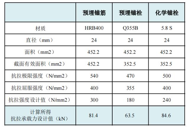 下表通過簡(jiǎn)單的計(jì)算,列比了同等直徑下錨筋、錨栓、化錨的抗拉承載力設(shè)計(jì)值,以供參考。